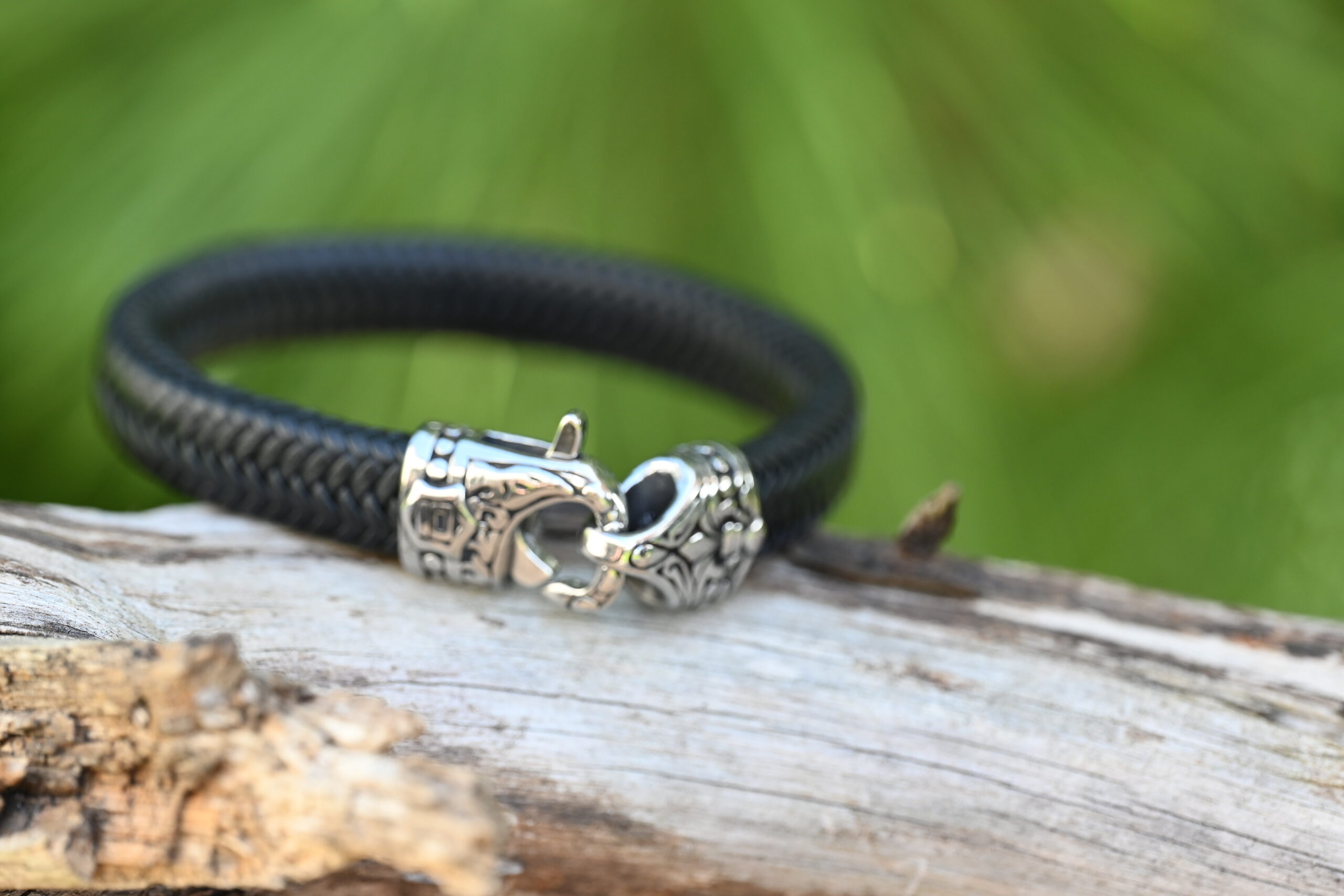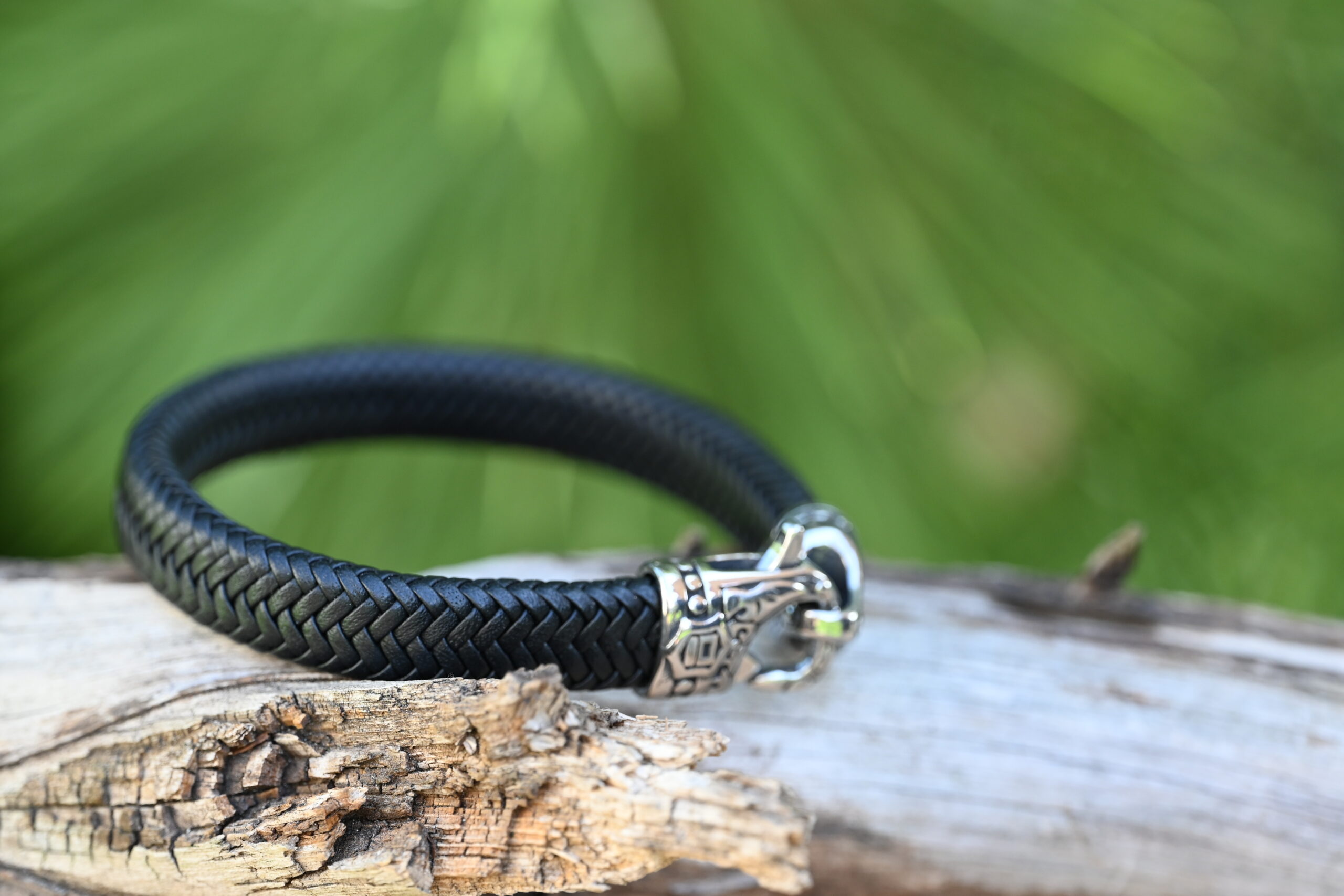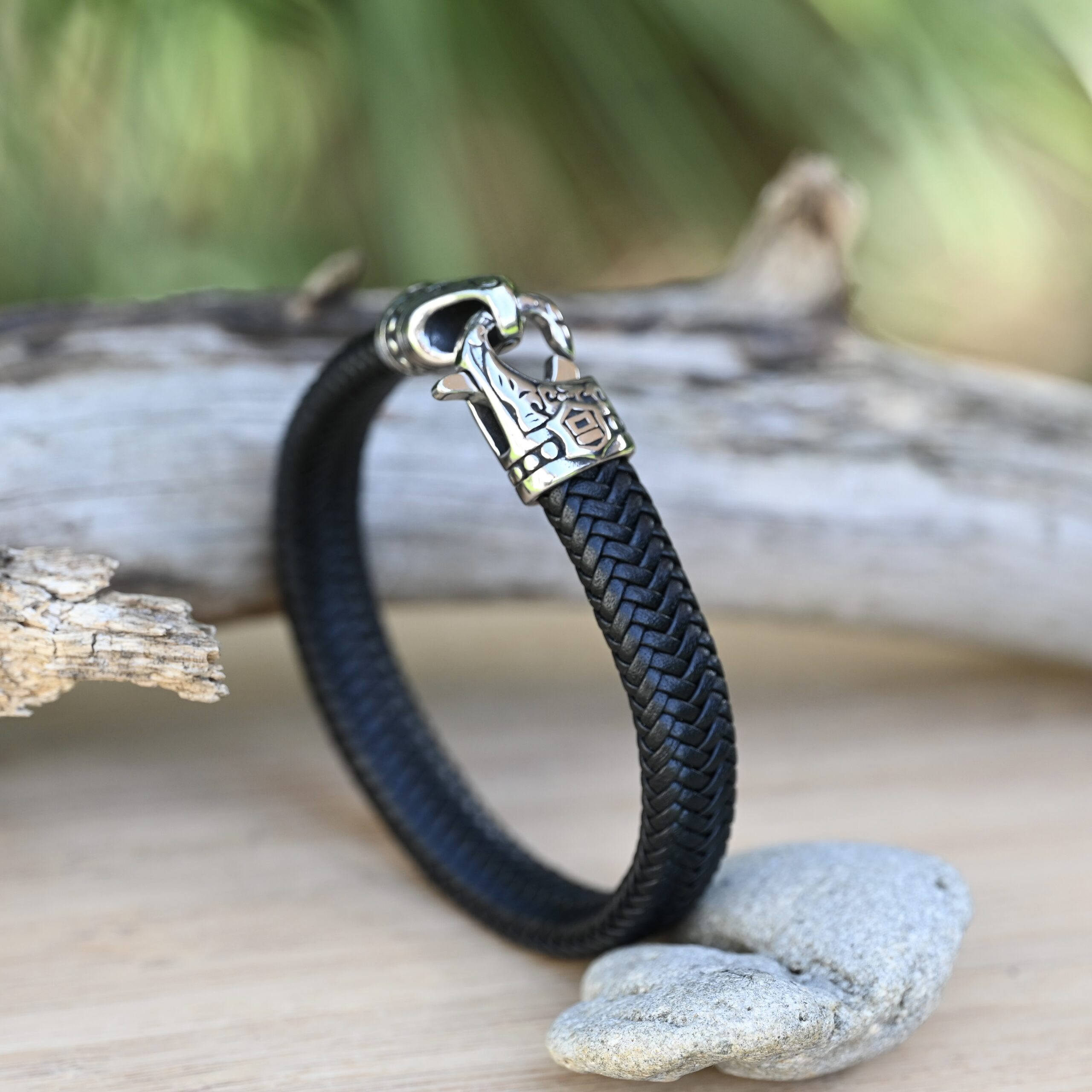Meeste käevõru jõulise põimitud naha ja tugeva roostevabast terasest kinnitusega. Vastupidav, niiskuskindel ning sobib igapäevaseks kandmiseks.