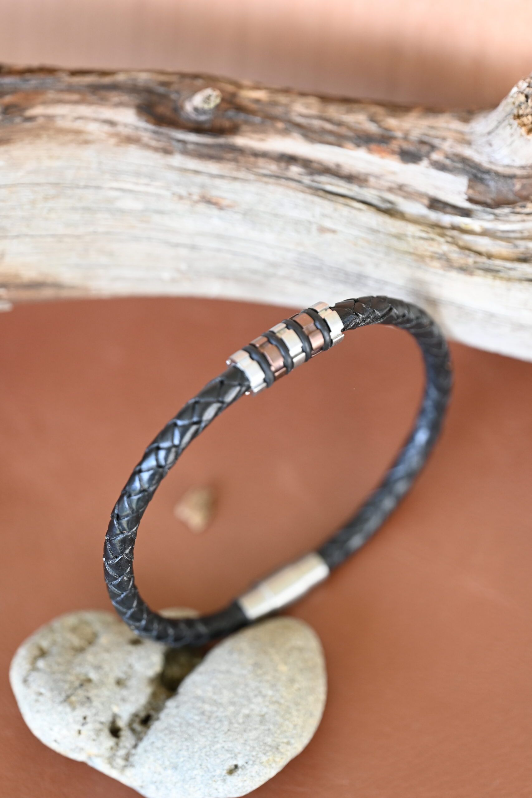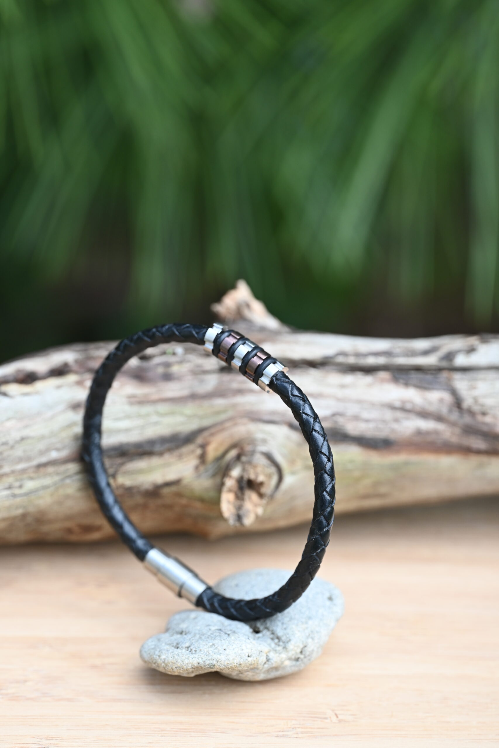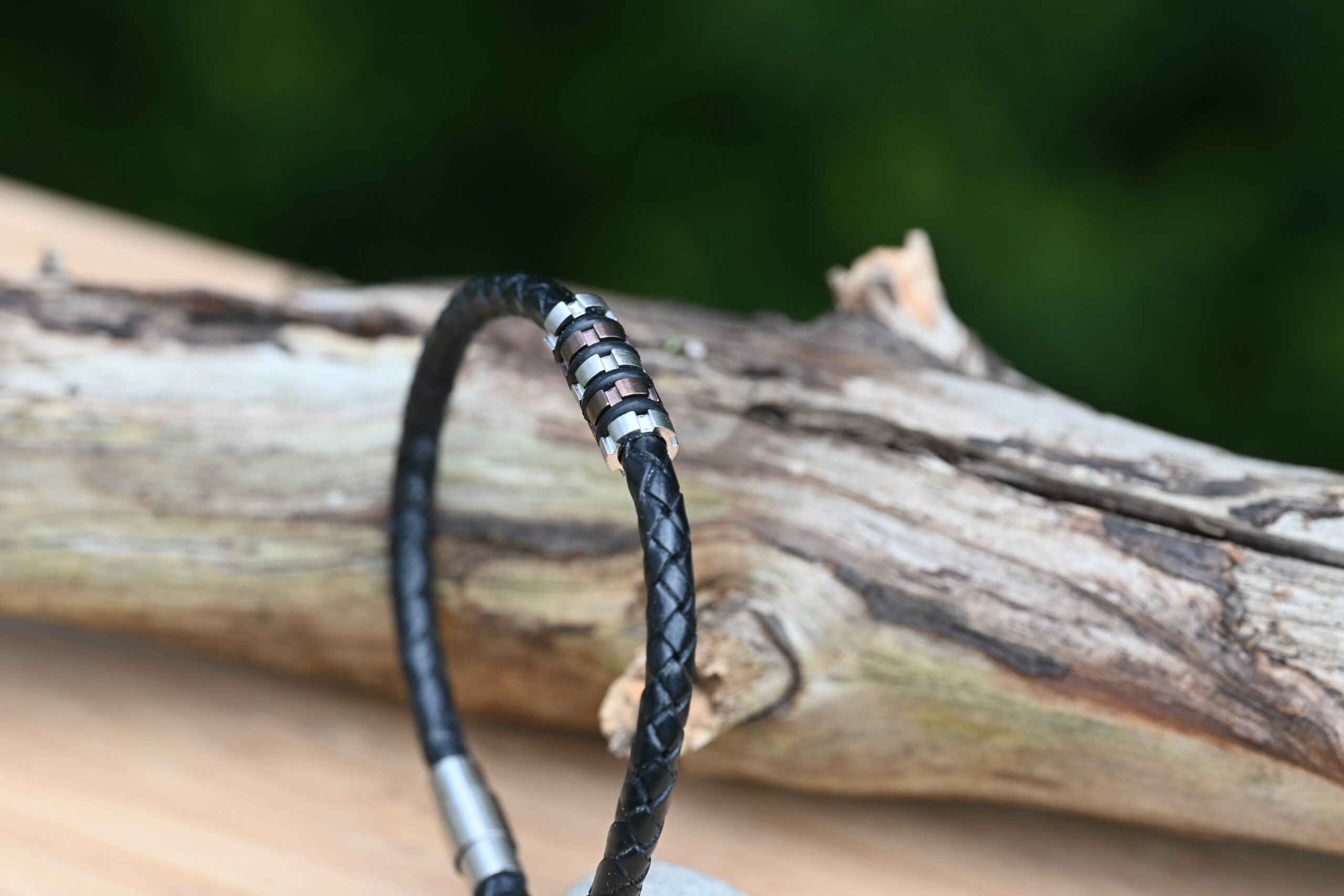 Meeste käevõru jõulise põimitud naha ja tugeva roostevabast terasest kinnitusega. Vastupidav, niiskuskindel ning sobib igapäevaseks kandmiseks.