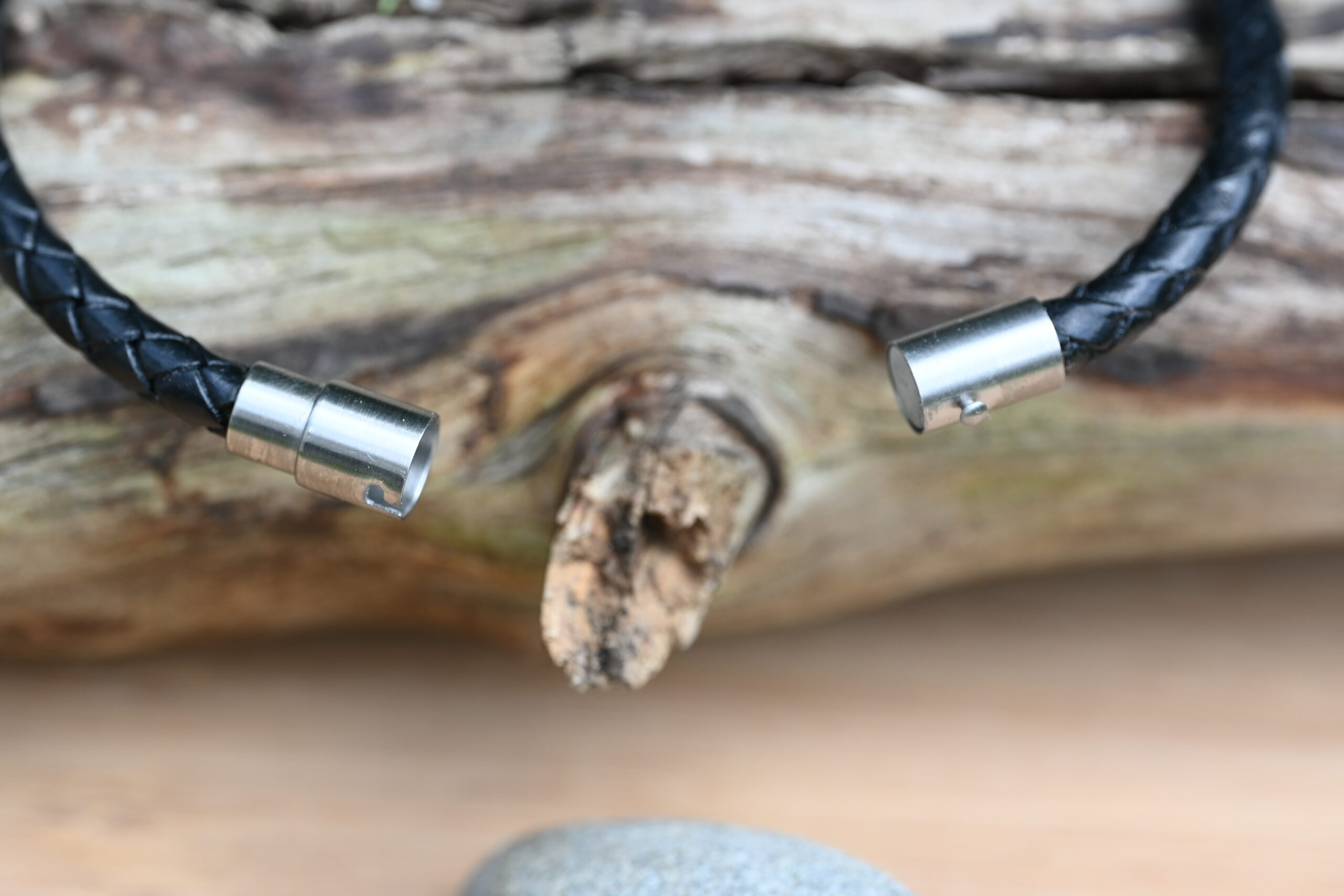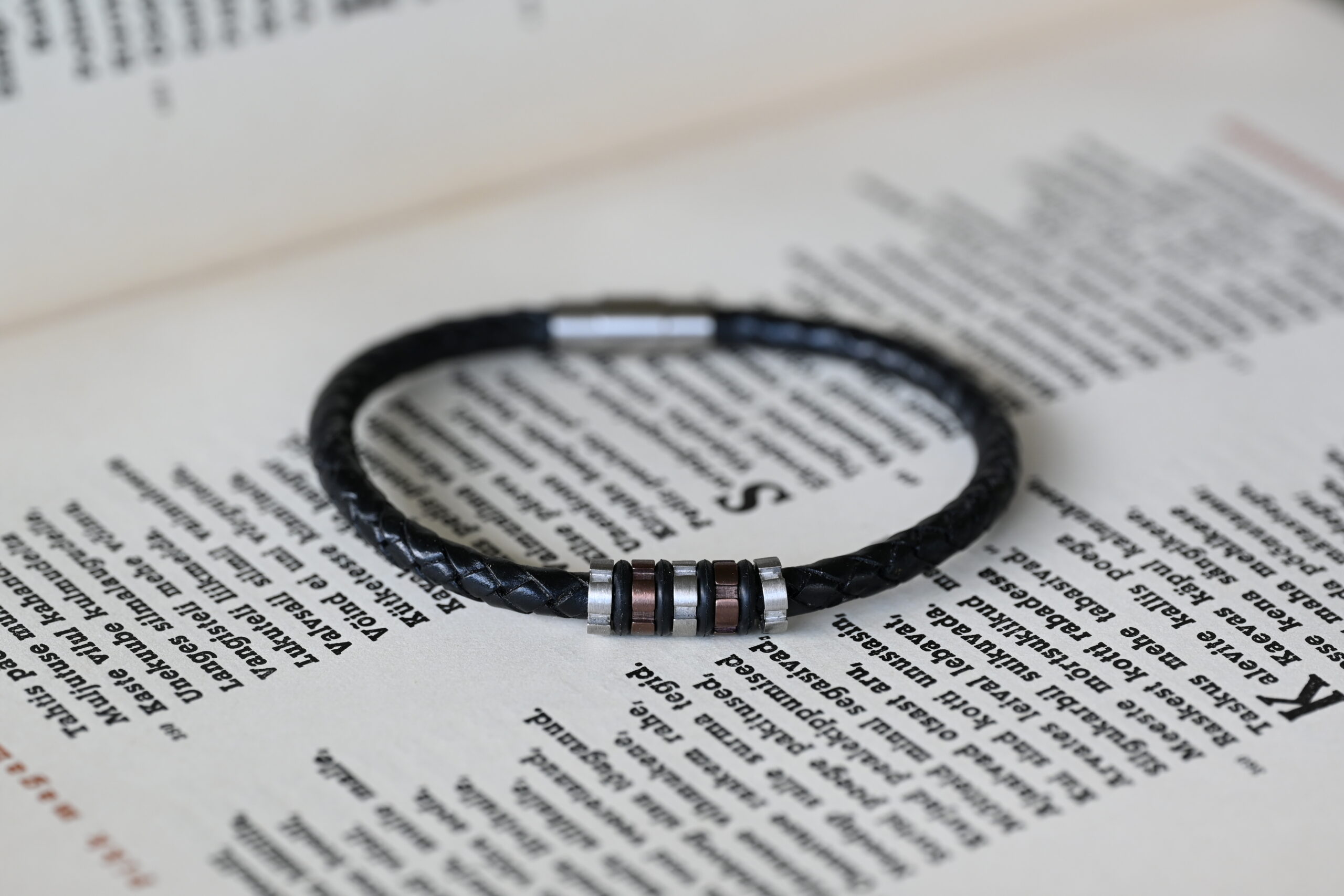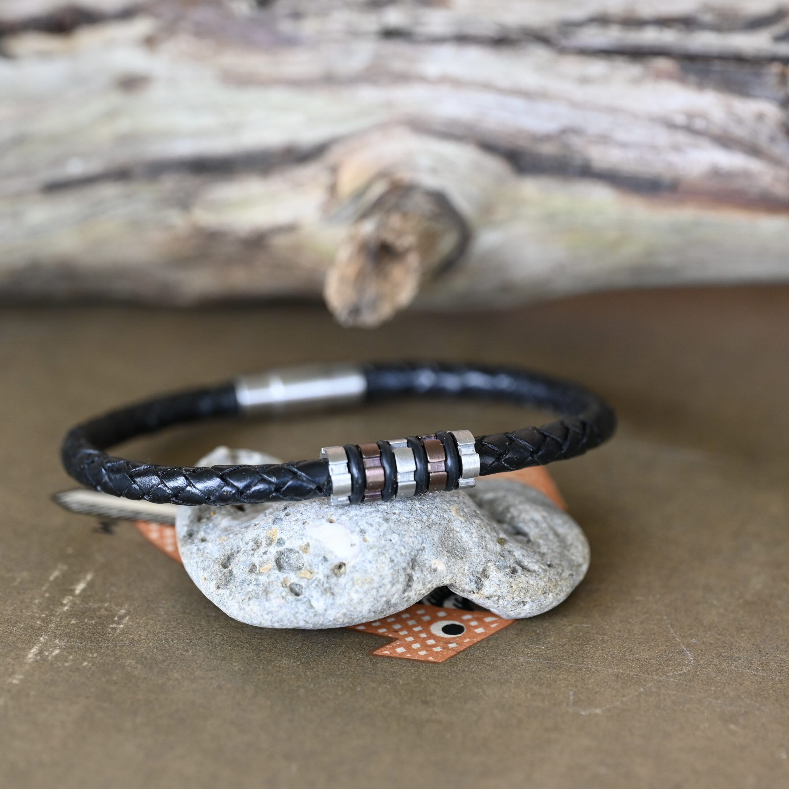 Meeste käevõru jõulise põimitud naha ja tugeva roostevabast terasest kinnitusega. Vastupidav, niiskuskindel ning sobib igapäevaseks kandmiseks.