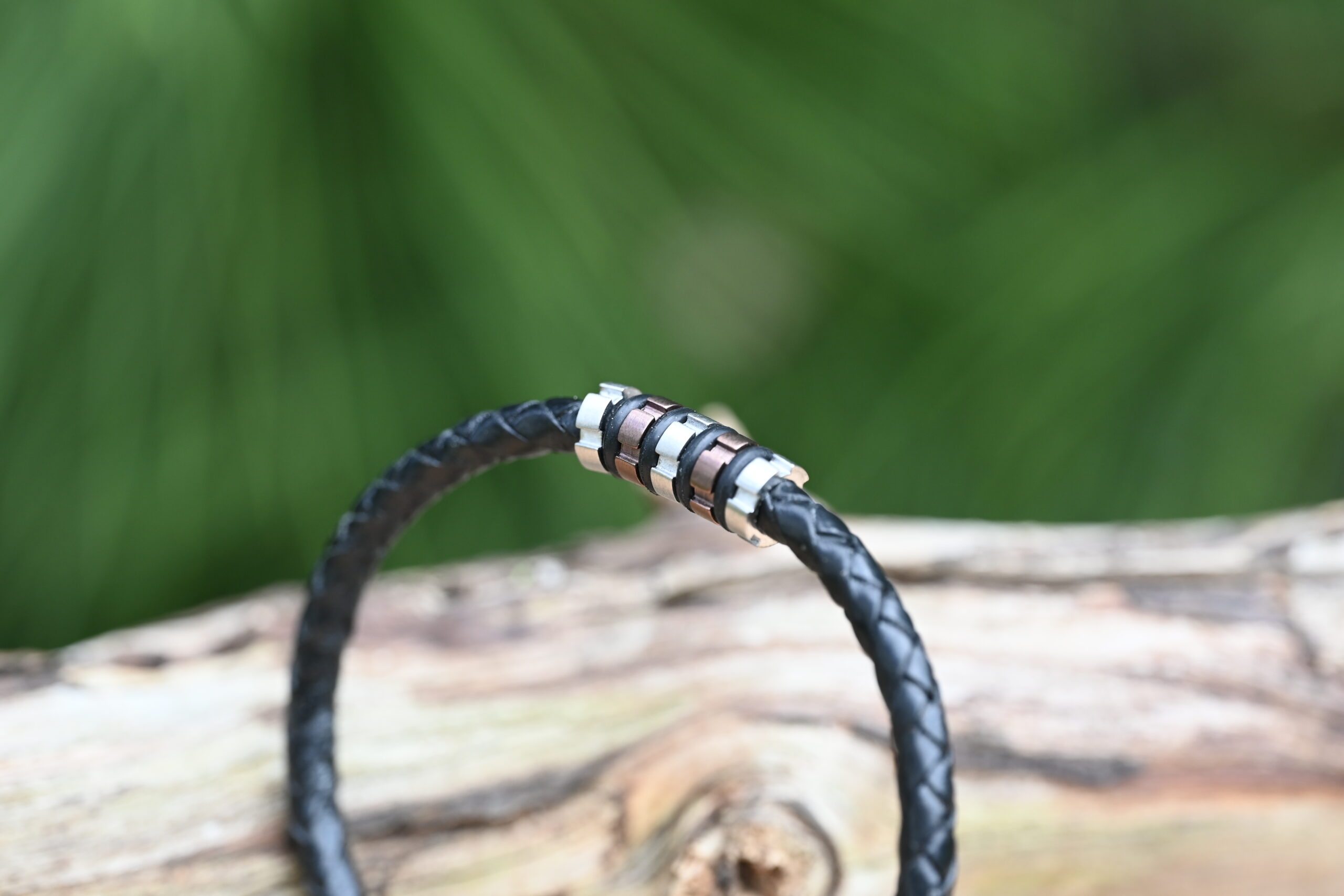 See meeste käevõru on valmistatud ehtsast nahast ja vastupidavast roostevabast terasest. See on roostekindel, niiskuskindel, higikindel ja hüpoallergeenne. Vastupidav igapäevaseks kandmiseks, ei tuhmu ega jäta nahale rohelist värvi. Mugav kanda ja sobib ka tundlikule nahale.