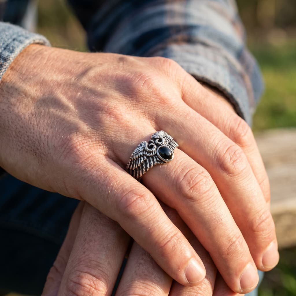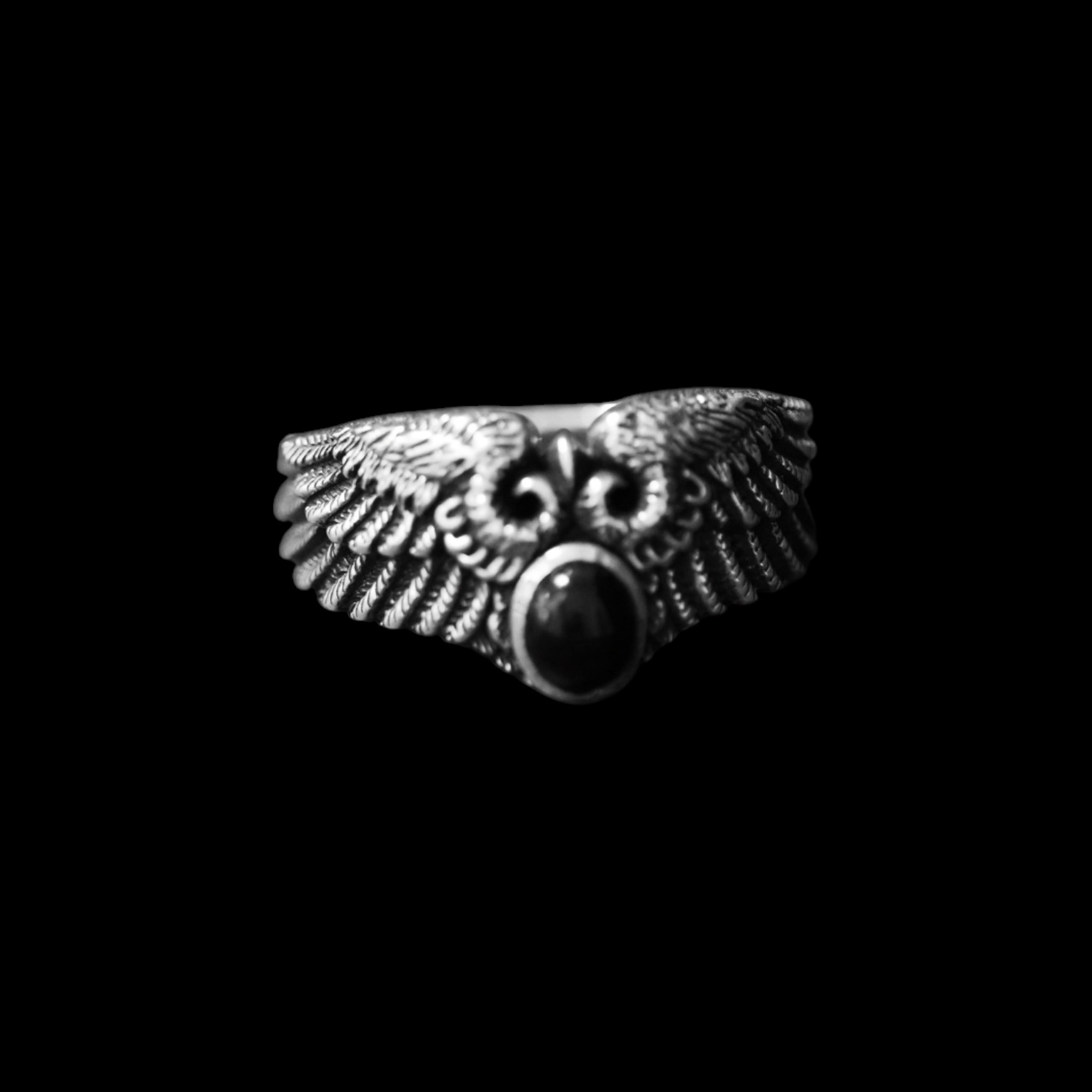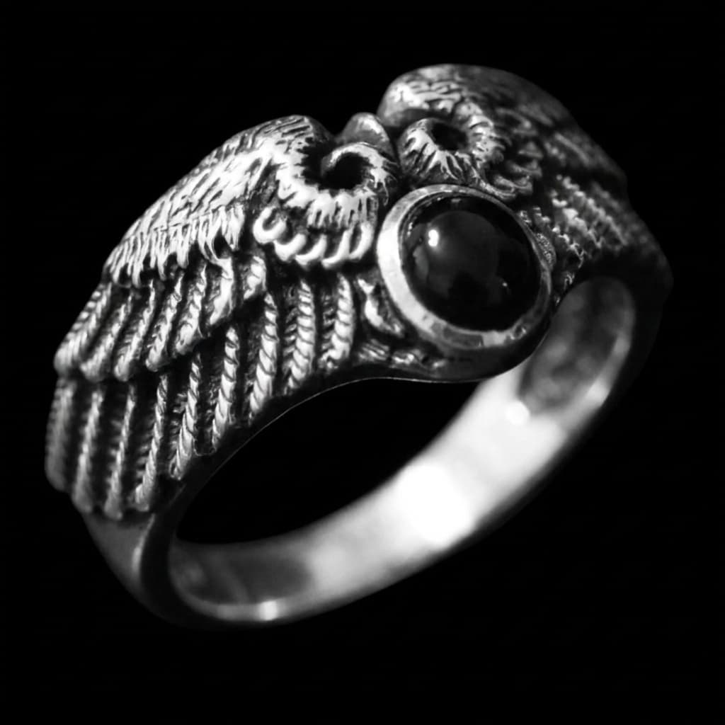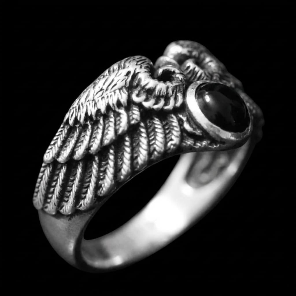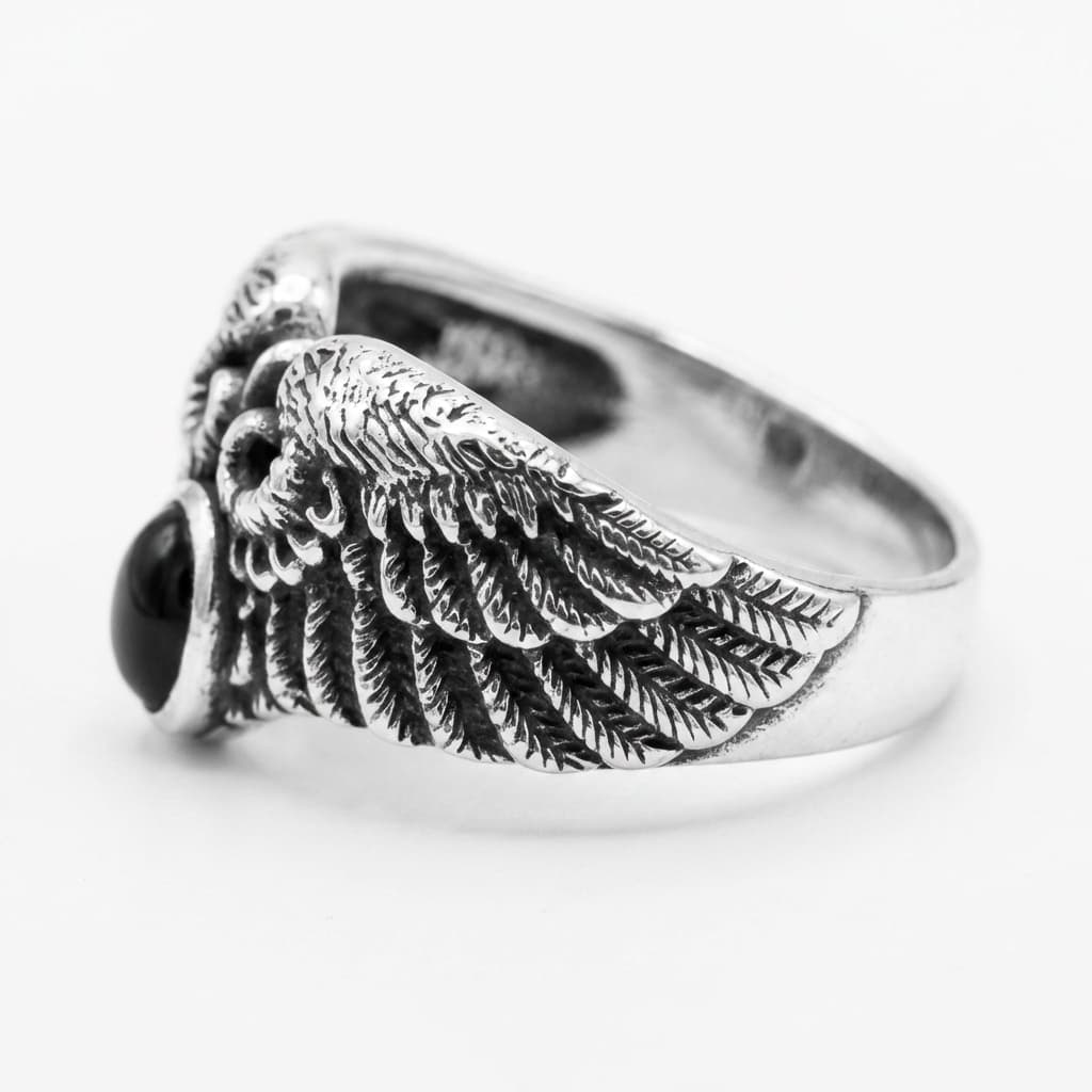 Valmistatud täishõbedast 925, see meeste sõrmus esitleb lihvitud musta onüksi kivi, mida raamivad keerukalt detailsed tiivad.