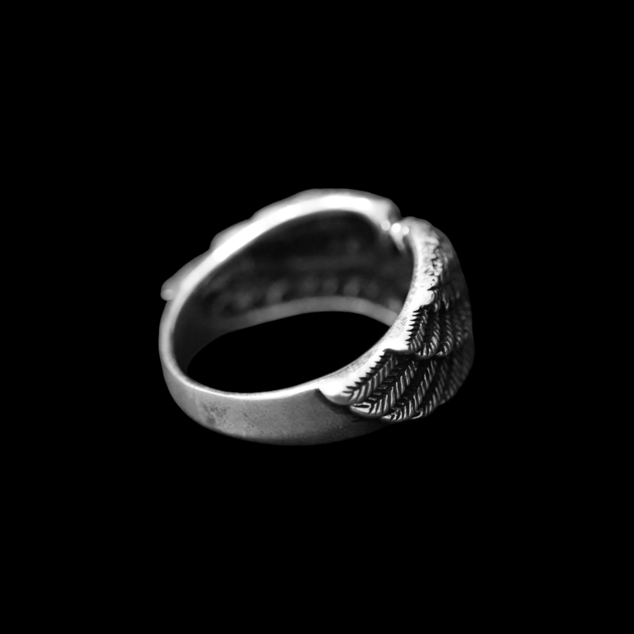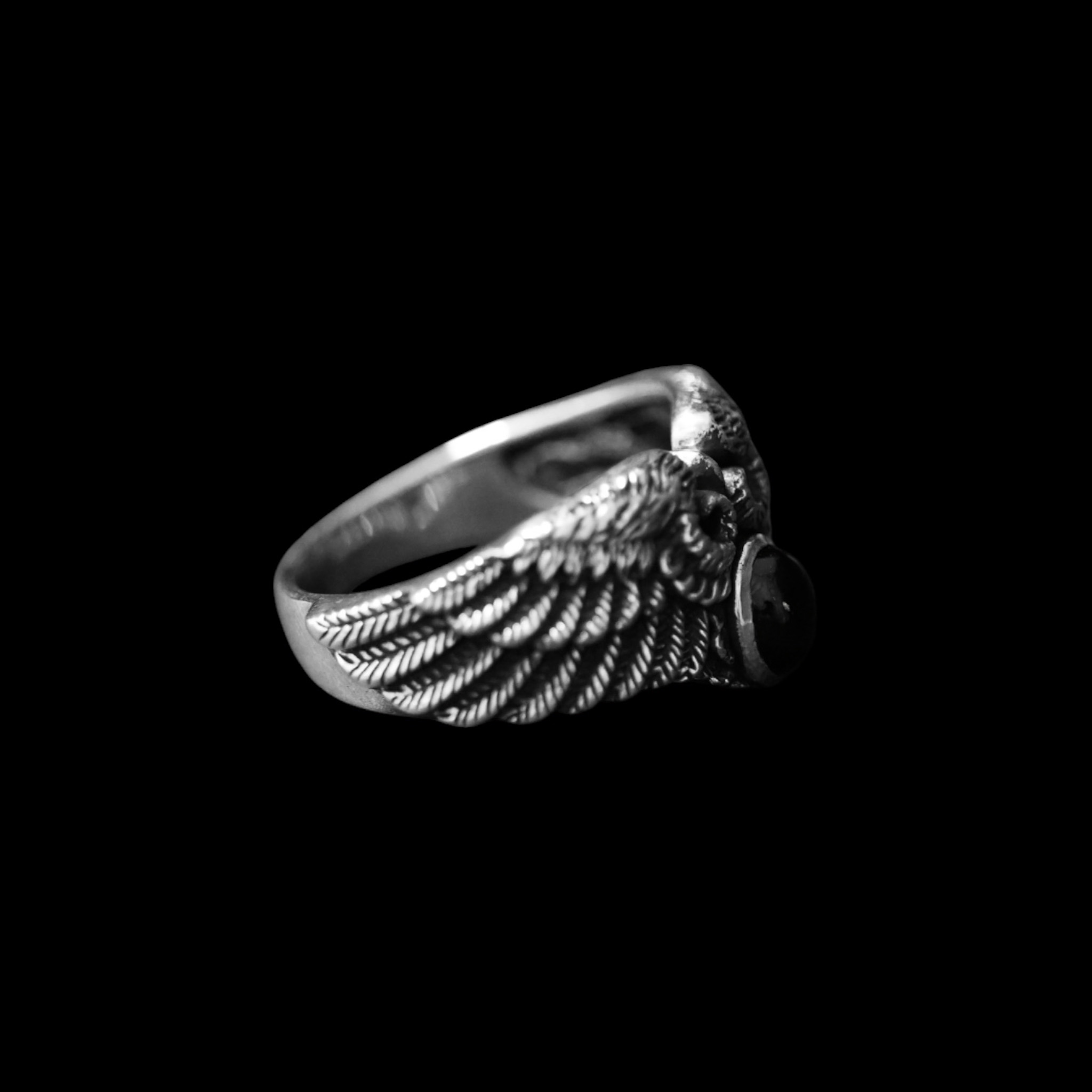 Täishõbedast 925 meeste sõrmus detailsete tiibade ja musta onüksi keskkiviga. Oksüdeeritud viimistlus.