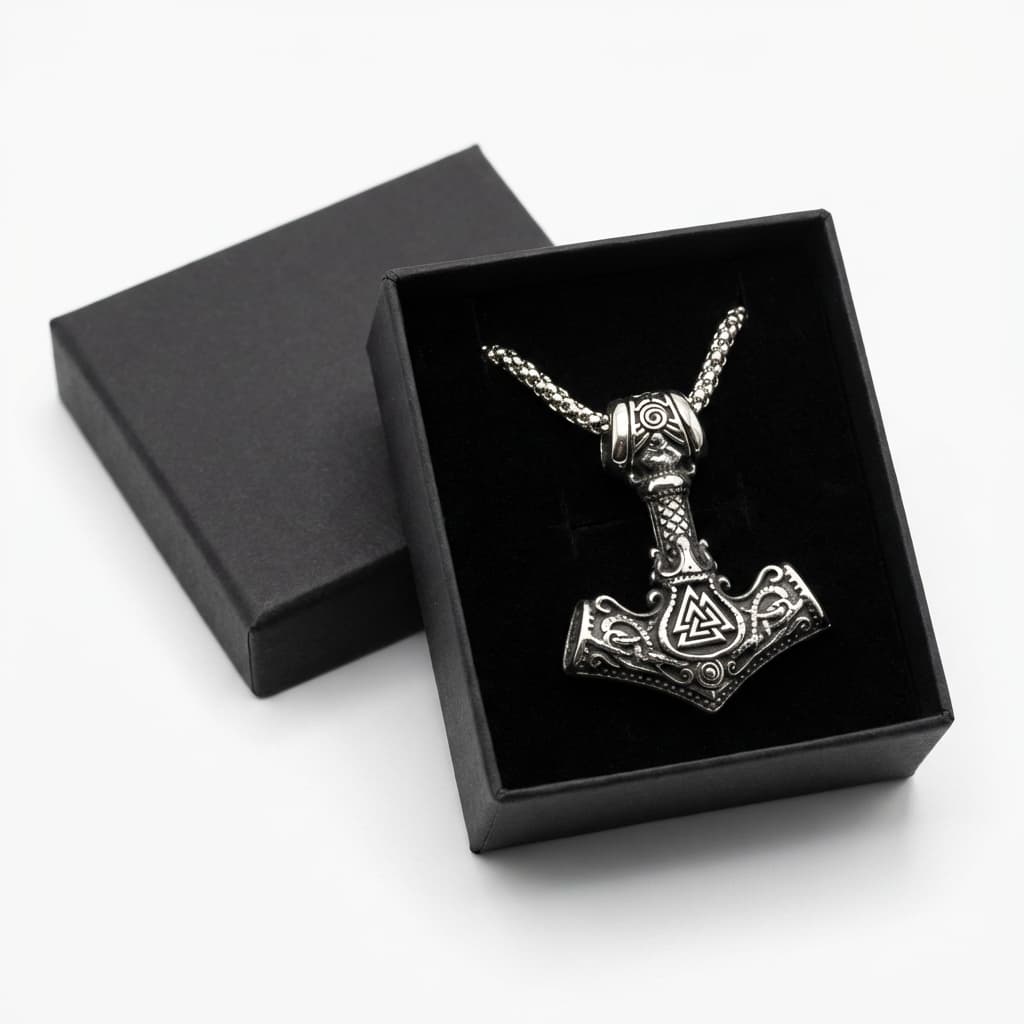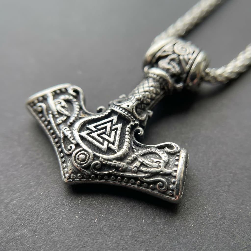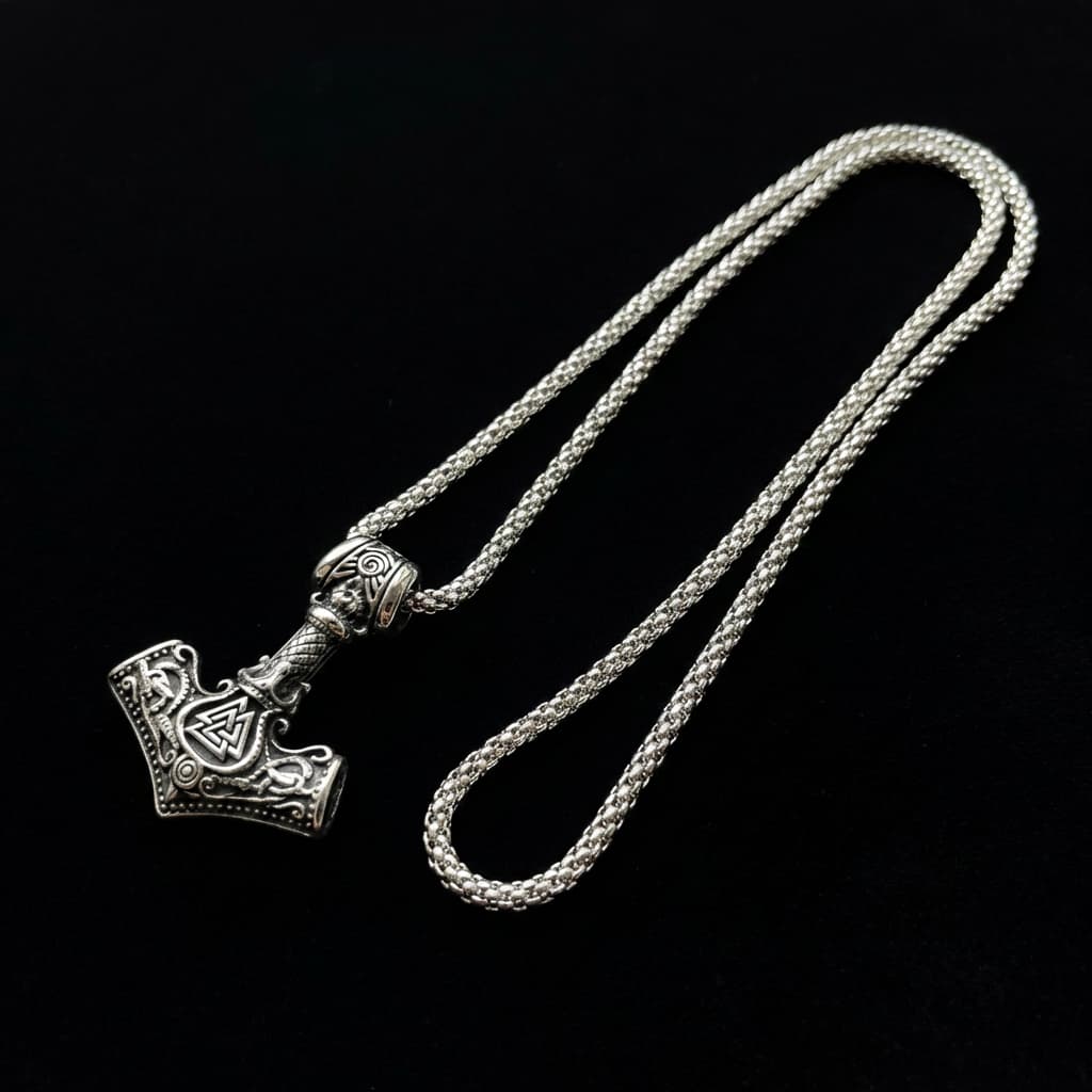 See meeste kaelakee on valmistatud vastupidavast roostevabast terasest. Ripats kujutab Mjölnirit — Thori haamrit — kaunistatud Valknut sümboli ja traditsiooniliste vikingimustritega, inspireeritud norra mütoloogiast. See on roostekindel, niiskuskindel, higikindel ja hüpoallergeenne. Vastupidav igapäevaseks kandmiseks, ei tuhmu ega jäta nahale rohelist värvi. Mugav kanda ja sobib ka tundlikule nahale.