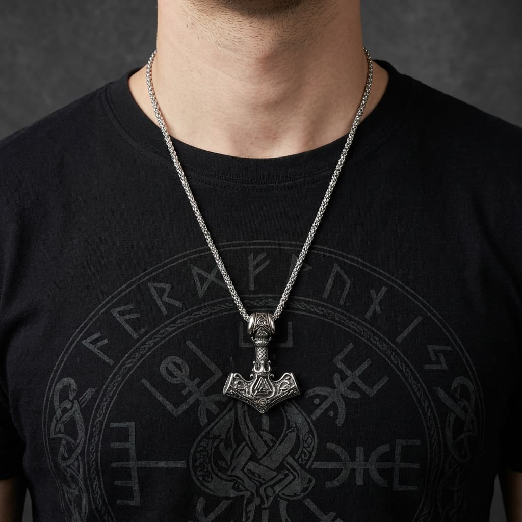 Meeste roostevabast terasest kaelakee Mjölniri ripatsiga — Thori haamri kujutis Valknut sümboliga, inspireeritud norra mütoloogiast.