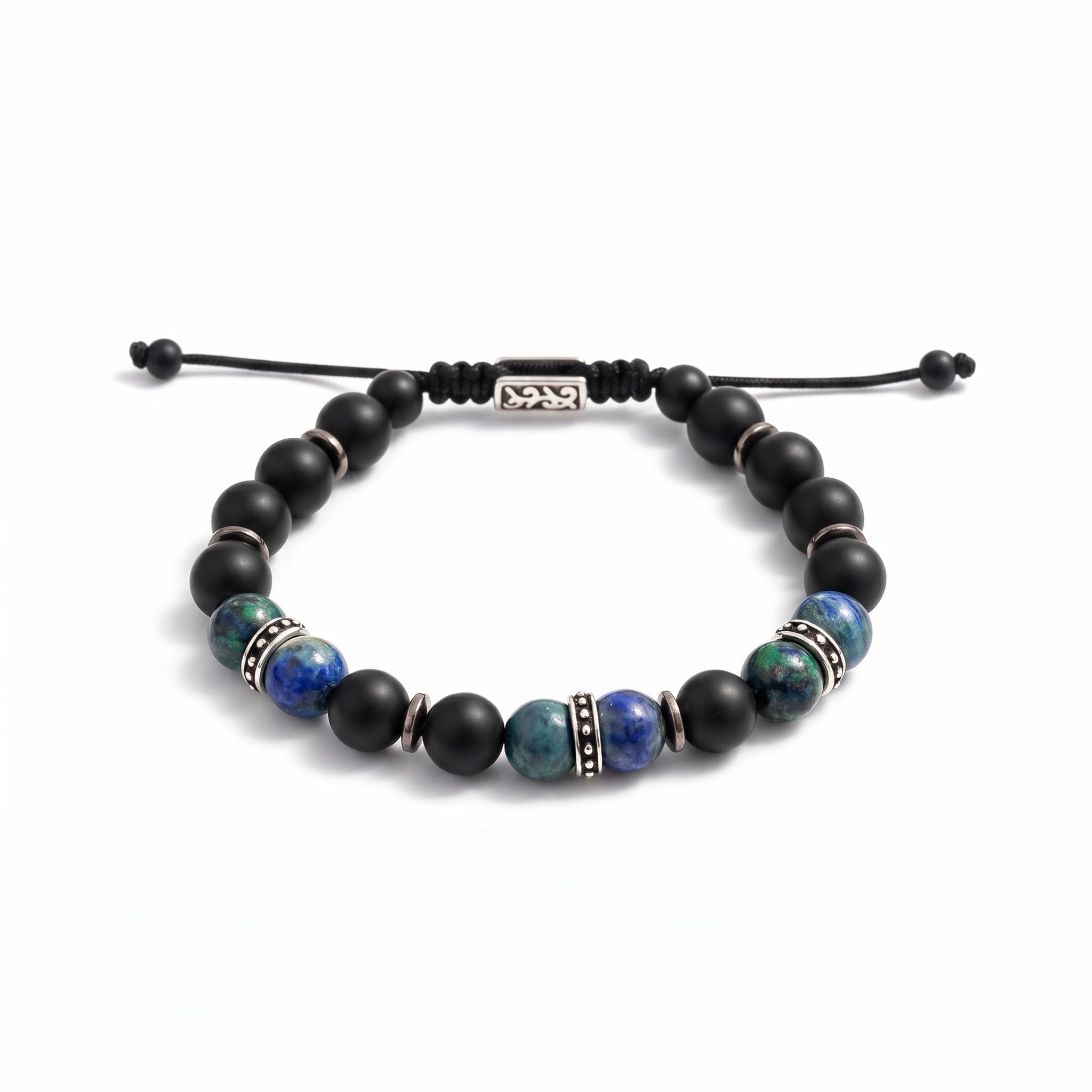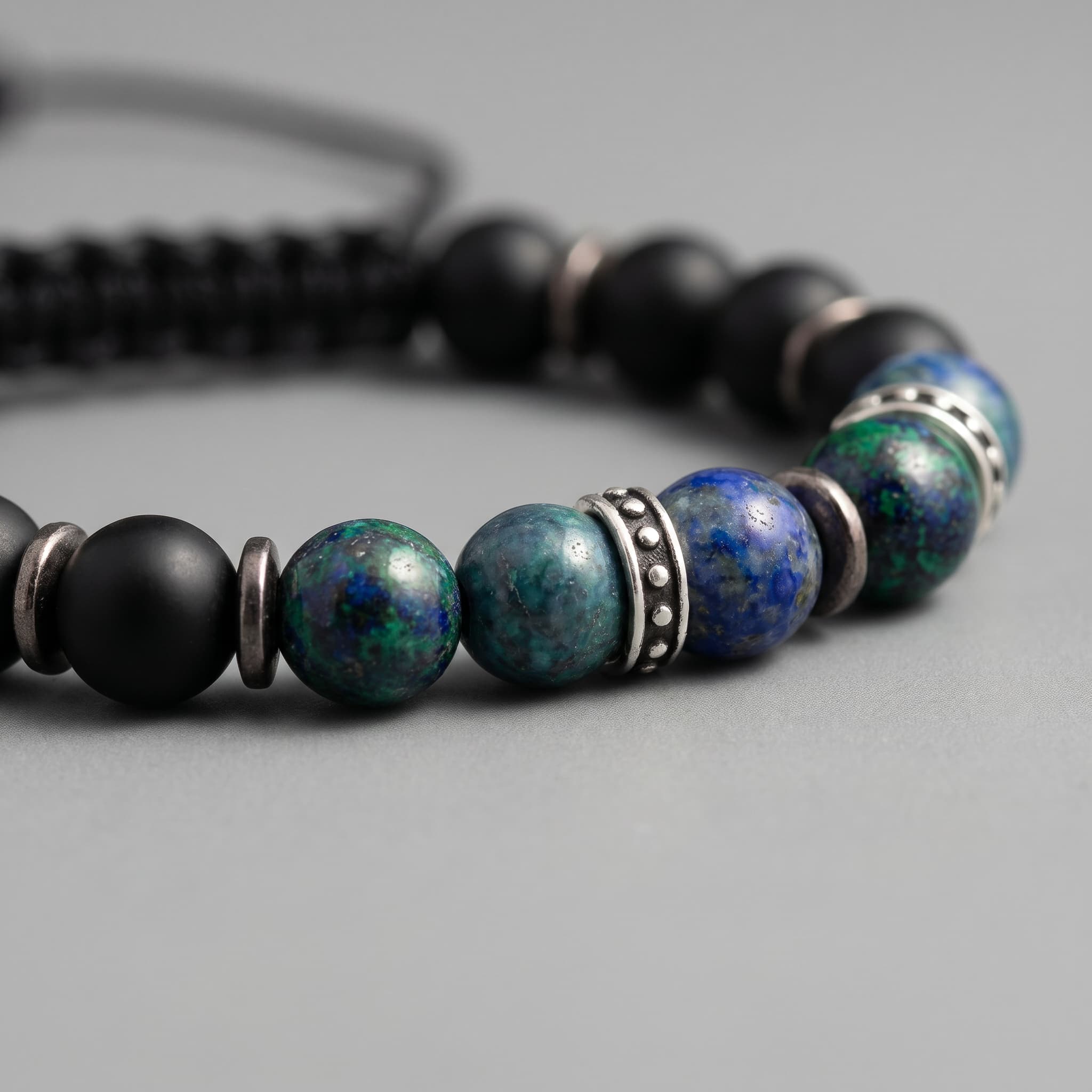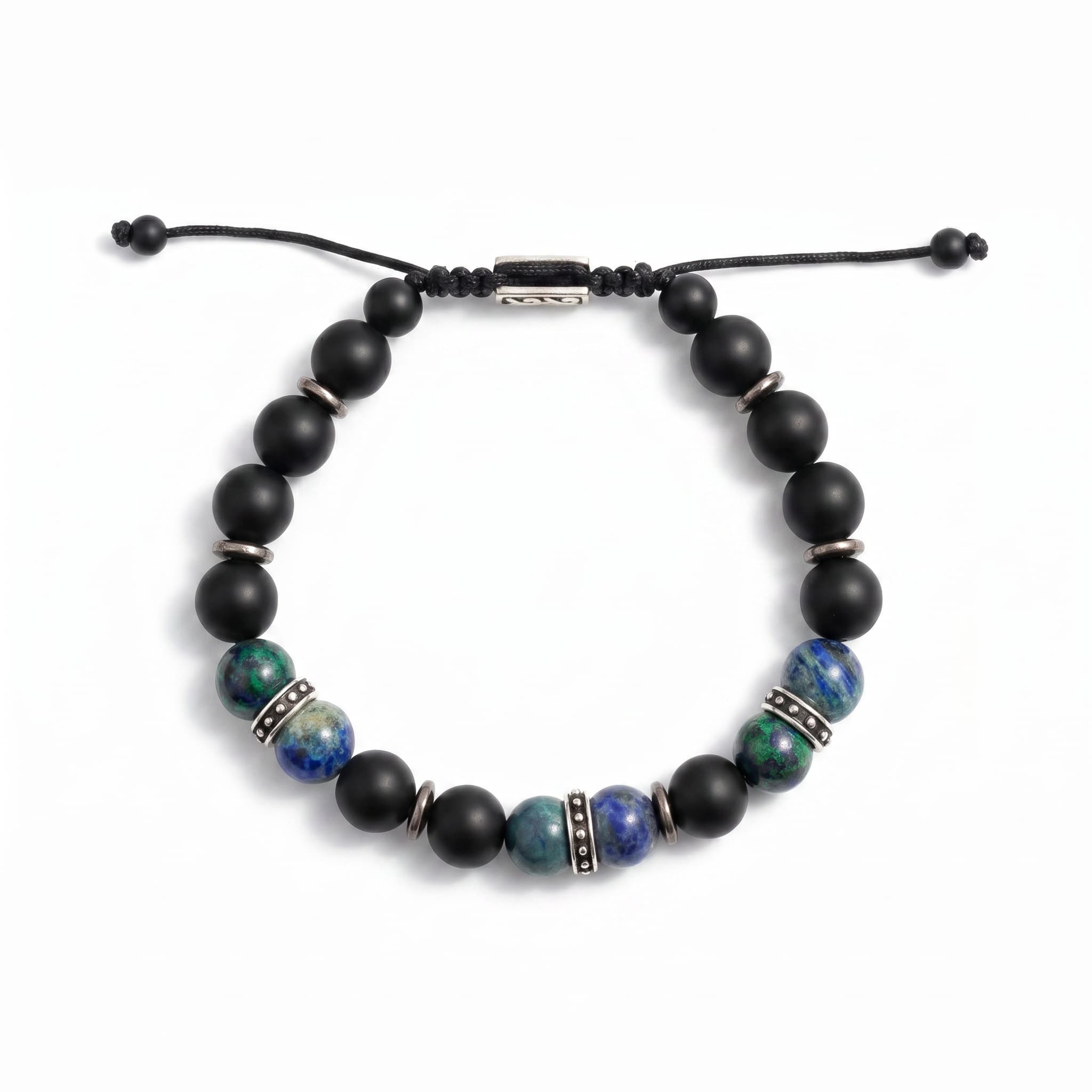 Reguleeritav meeste käevõru matt onyks- ja azuriit-malahiit poolvääriskivide ning roostevaba terase detailidega.