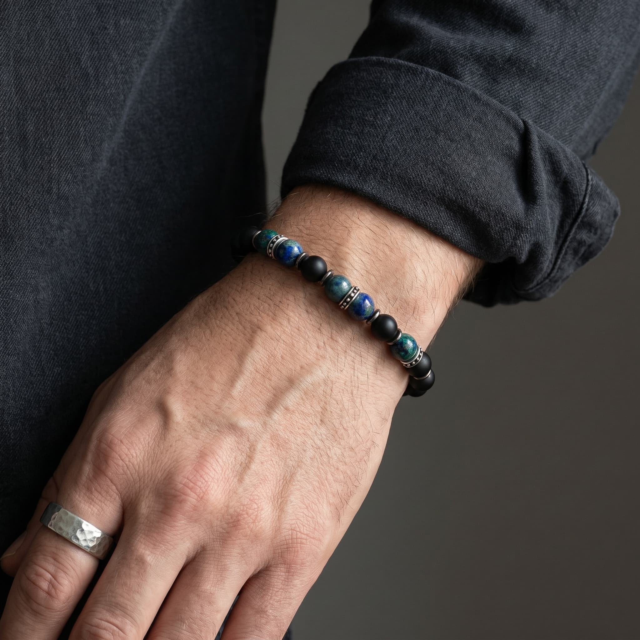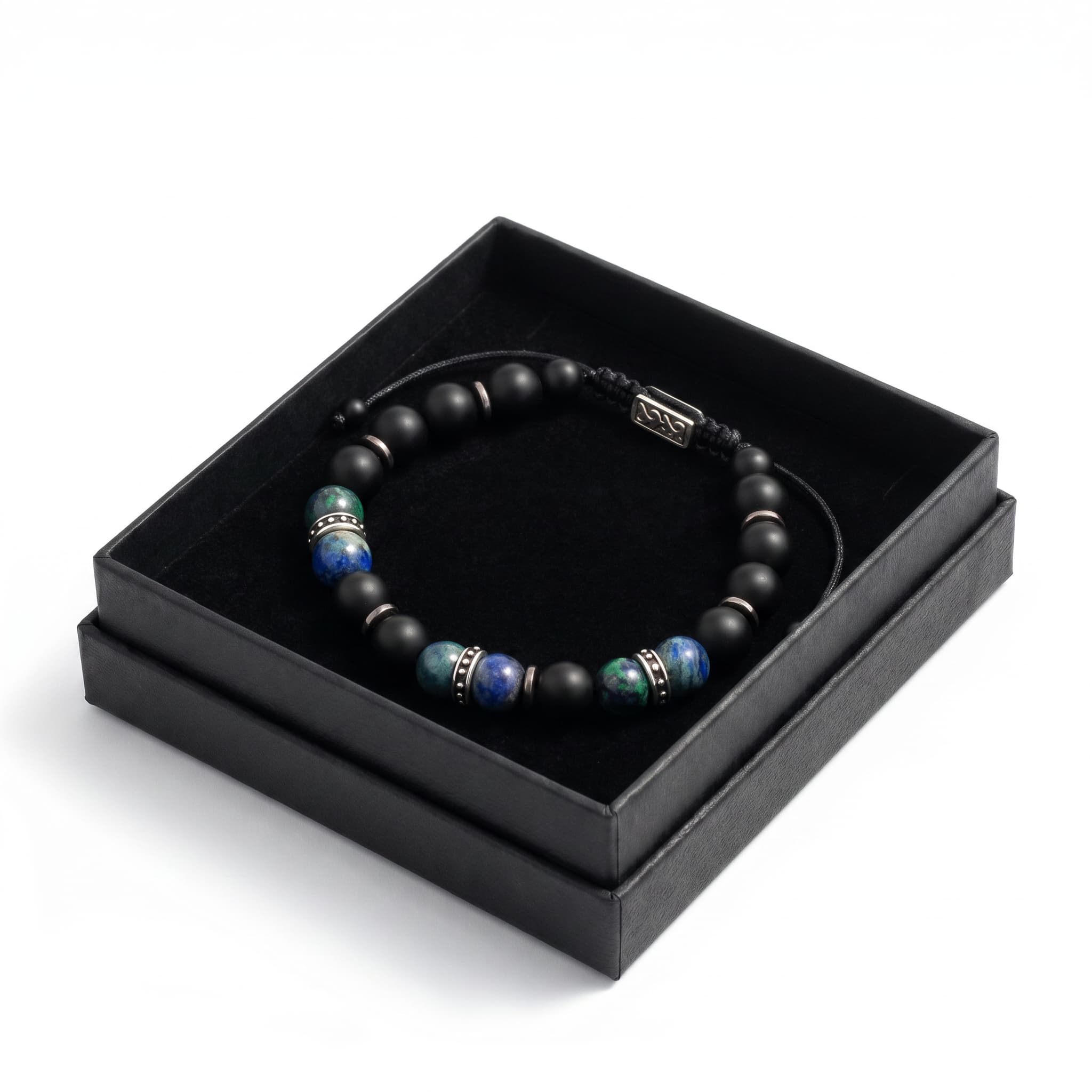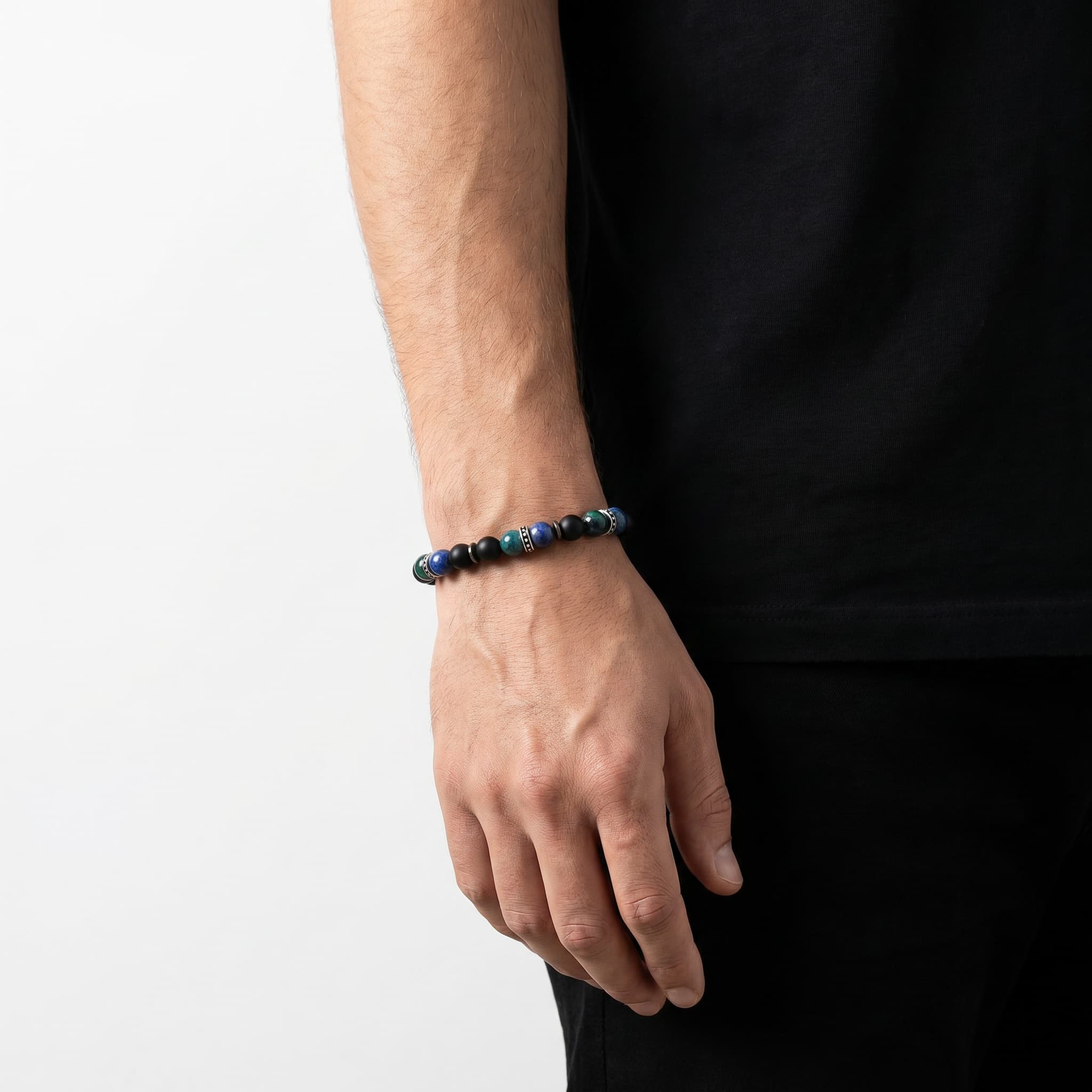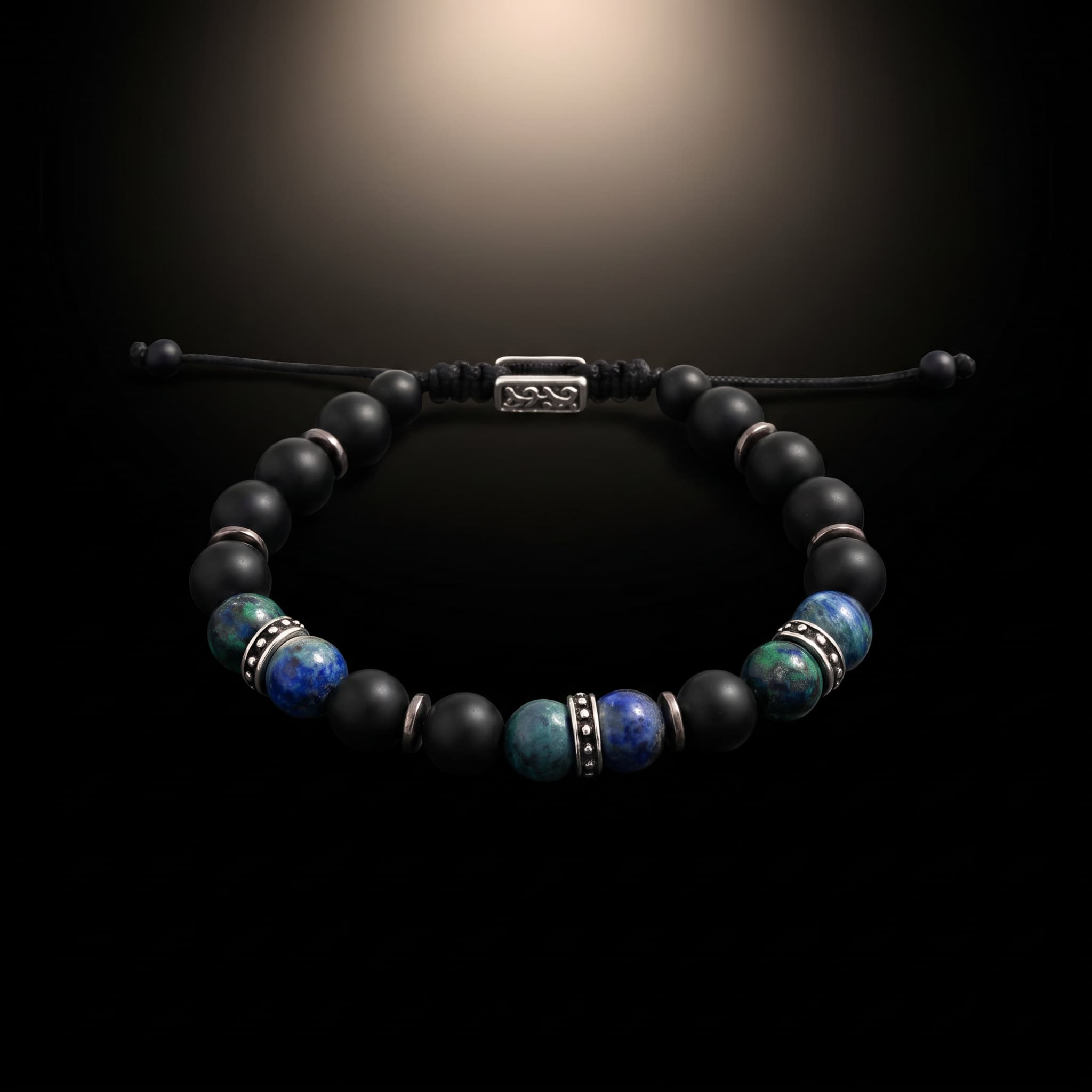 See meeste käevõru on valmistatud matt onyks ja azuriit-malahiit poolvääriskividest ning roostevaba terase detailidest. See on roostekindel, niiskuskindel, higikindel ja hüpoallergeenne. Vastupidav igapäevaseks kandmiseks, ei tuhmu ega jäta nahale rohelist värvi. Mugav kanda ja sobib ka tundlikule nahale.