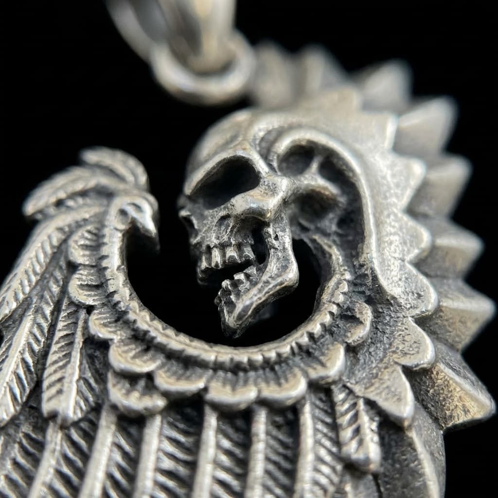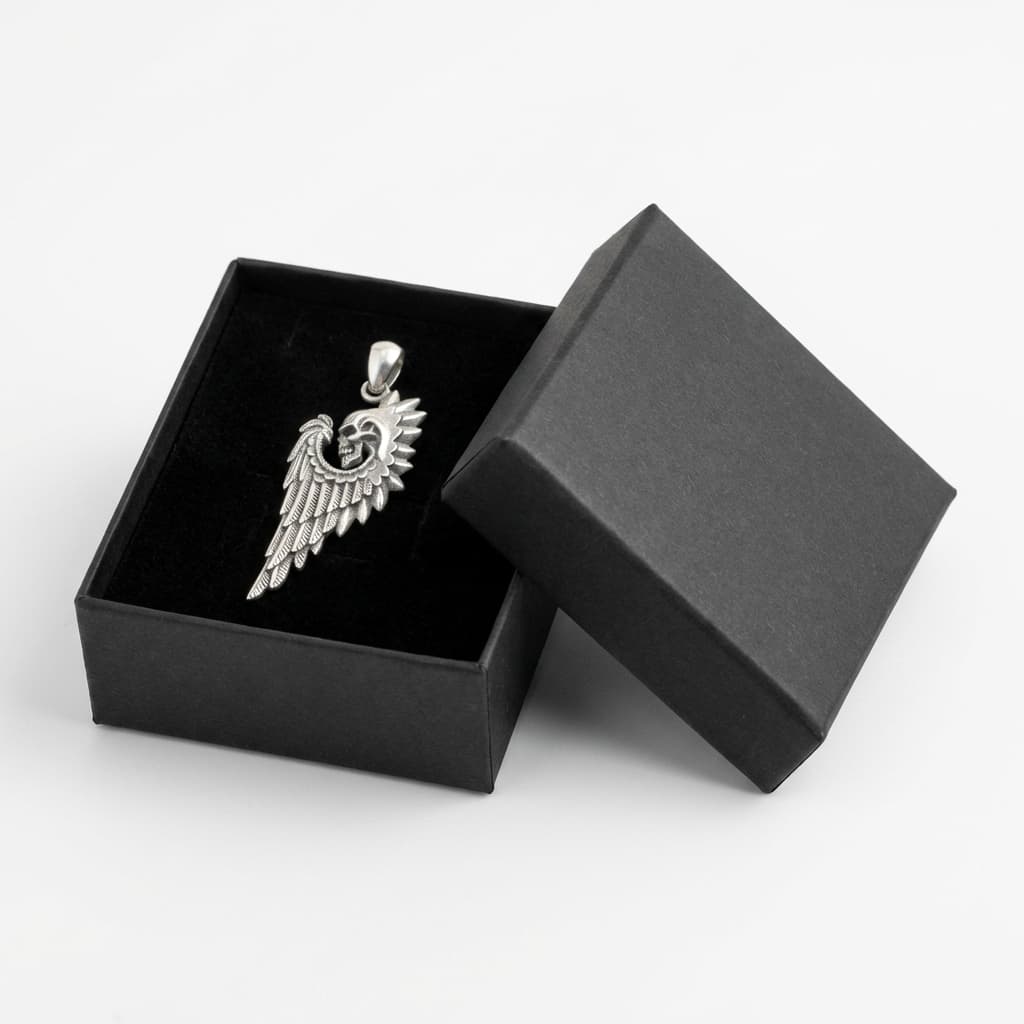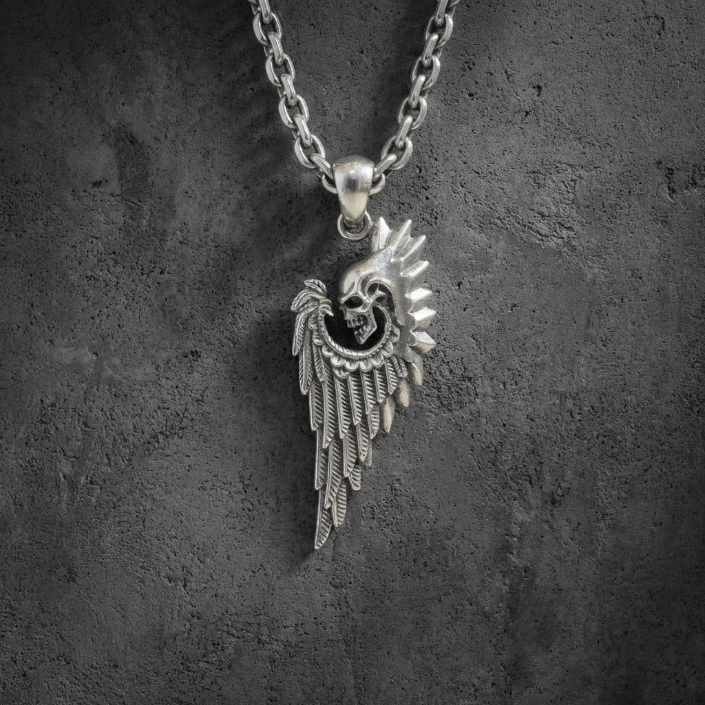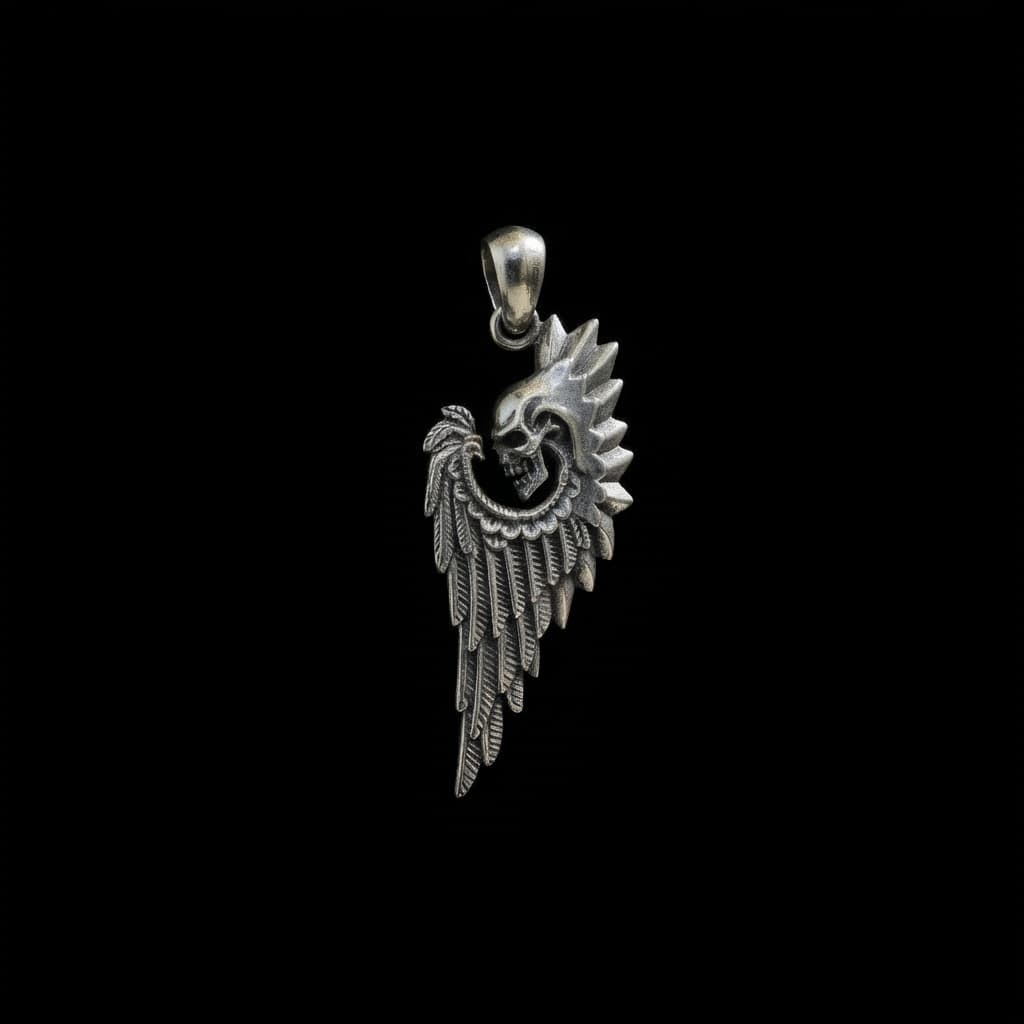 Valmistatud täishõbedast 925. Ripats kujutab koljut sulgedega tiiva ja okastega krooni taustal – detailirohke disain tugeva ja individuaalse väljendusega.