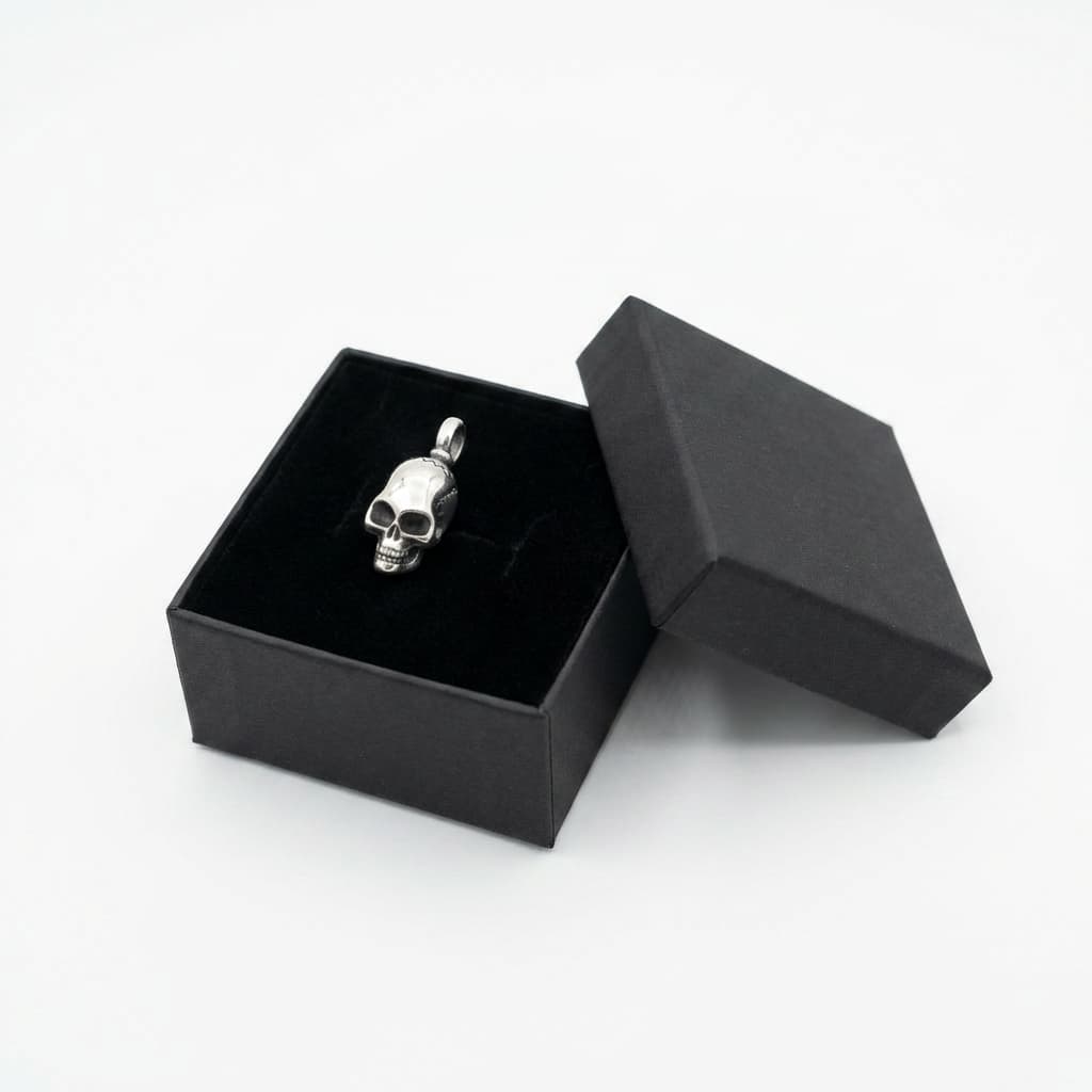 Valmistatud täishõbedast 925. Realistliku vormiga kolju ripats – selgete näojoonte ja sügavate silmakoobastega.