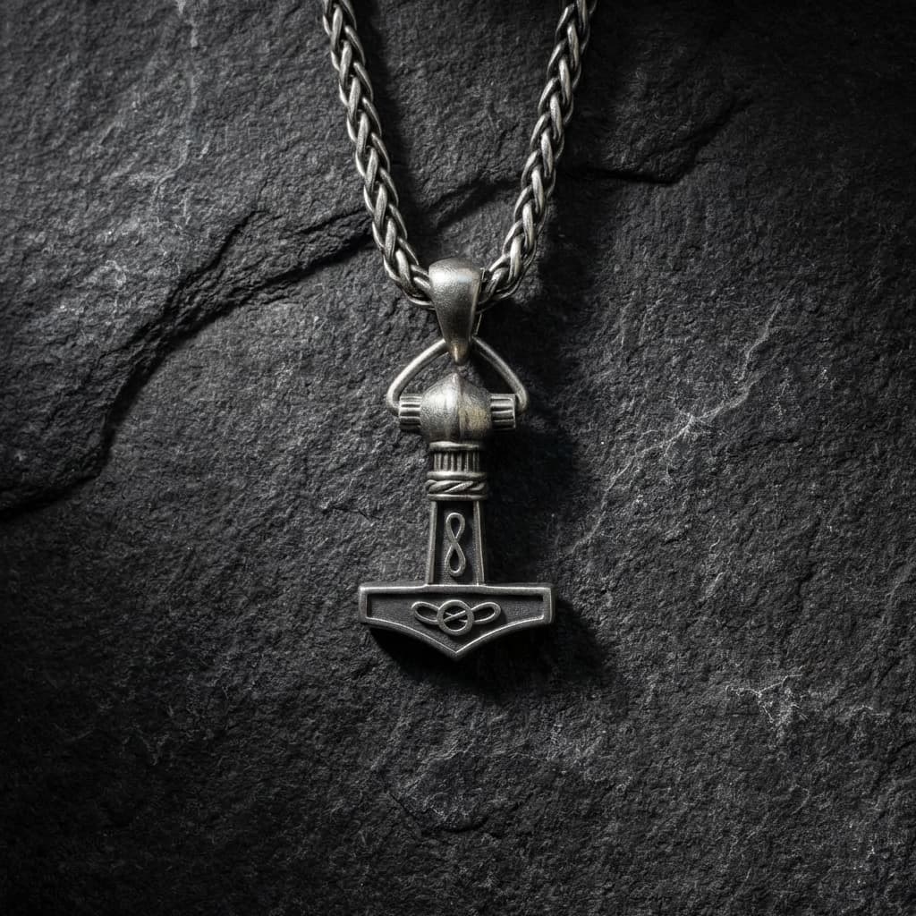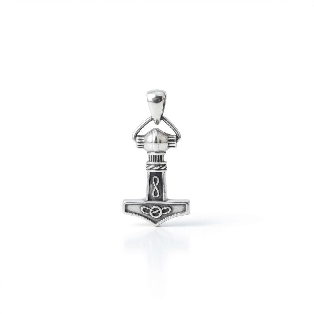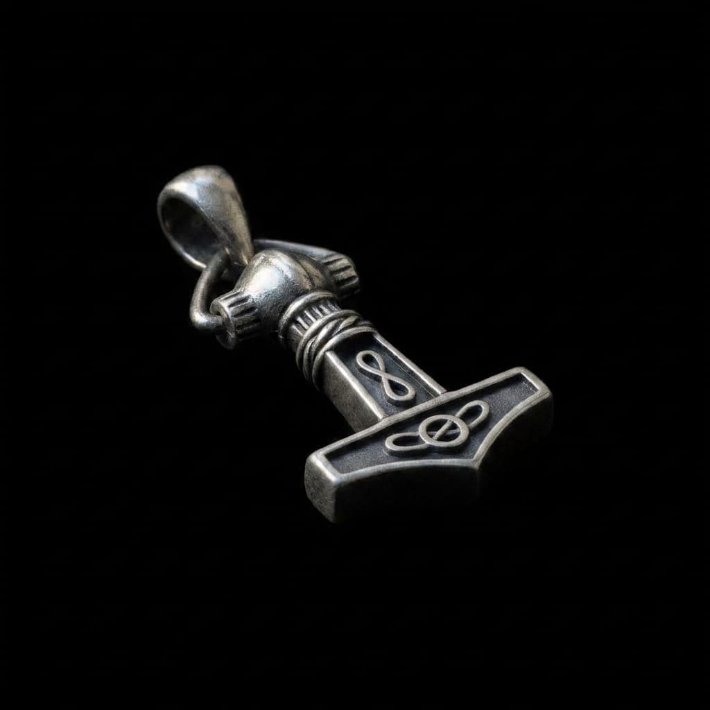 925 hõbedast Mjölniri ripats lõpmatussümboliga – detailne käepide ja graveeritud haamer.