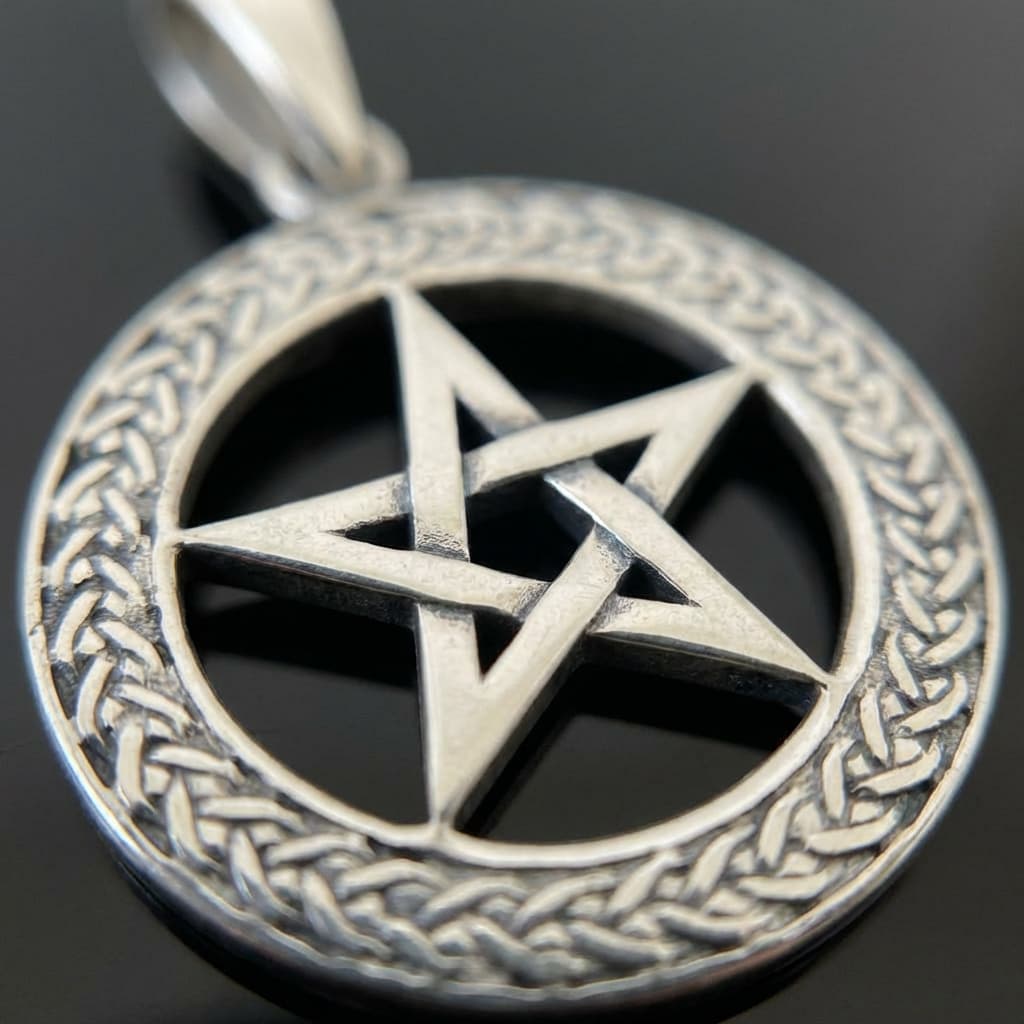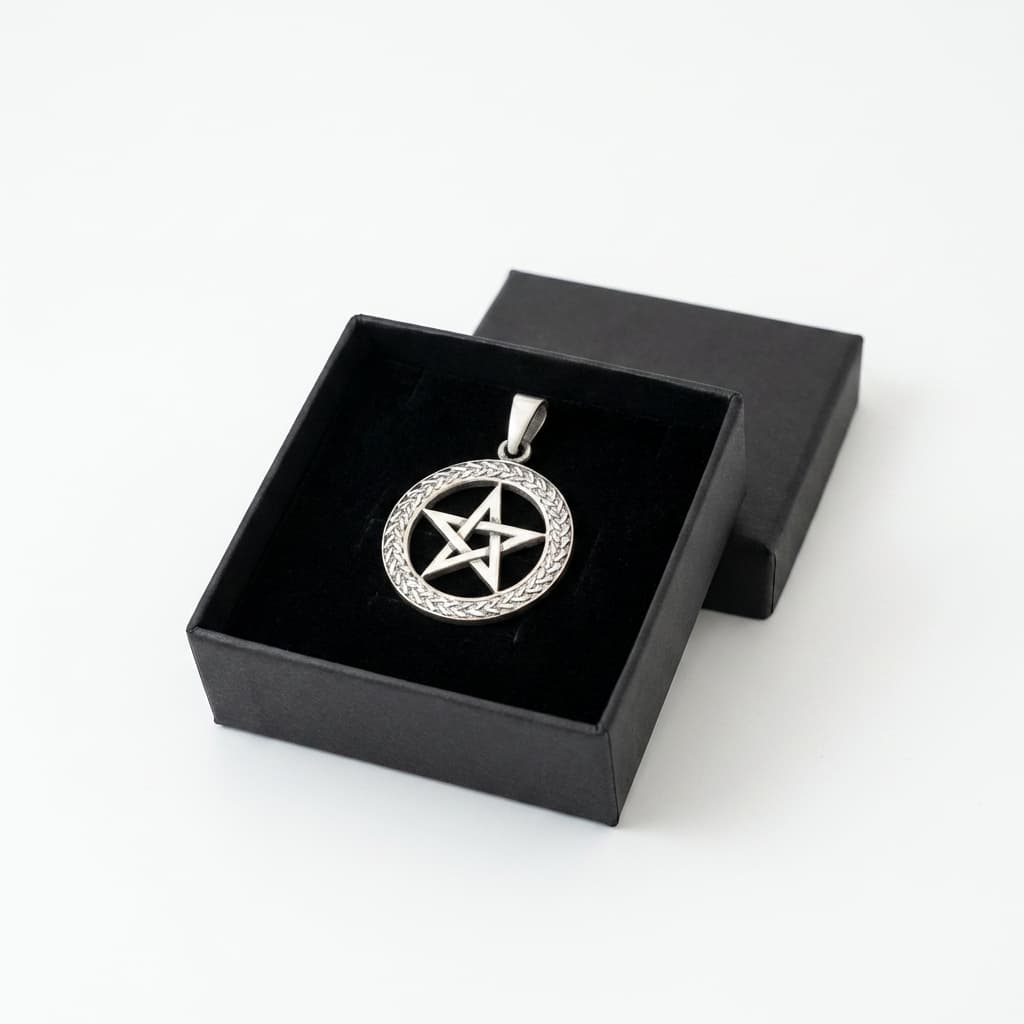 Valmistatud täishõbedast 925. Viieharuline täht on ümbritsetud punutud mustriga rõngaga, mis annab klassikalisele pentagrammile lisadimensiooni.