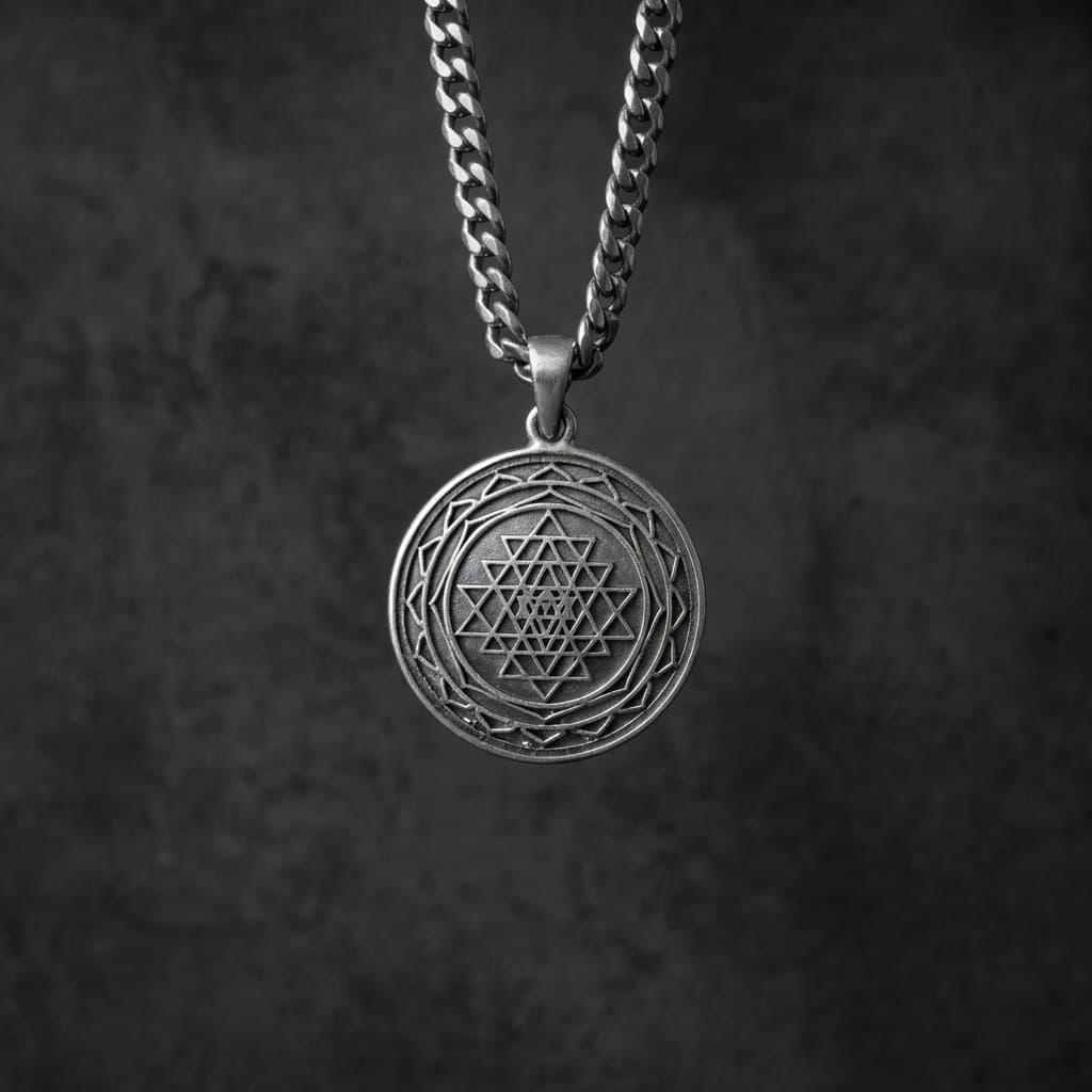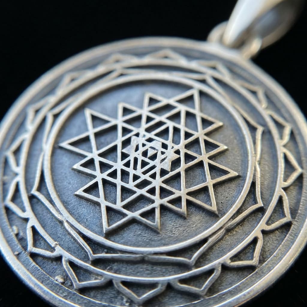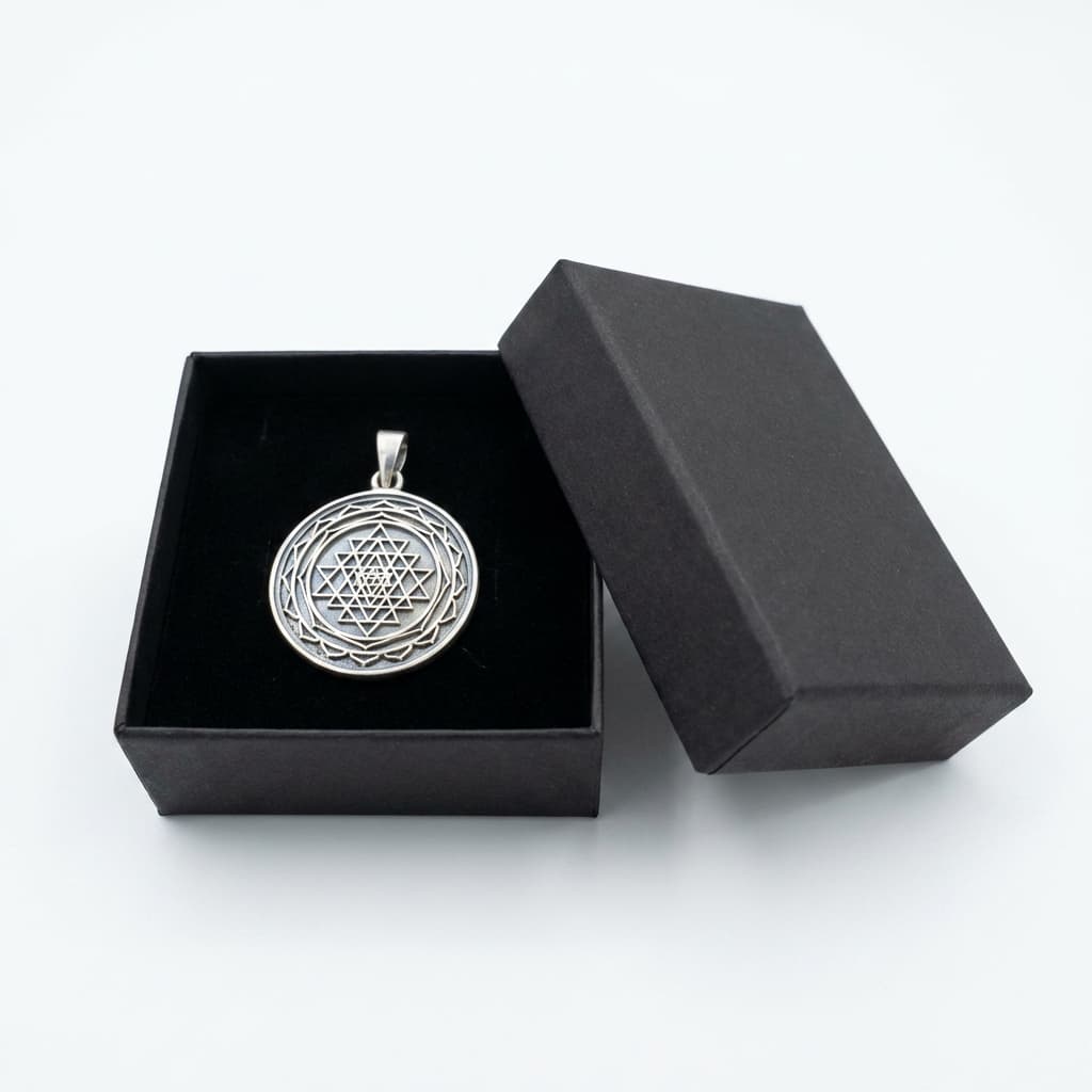 Valmistatud täishõbedast 925. Sri Yantra on üks iidseimaid ja võimsamaid geomeetrilisi sümboleid – üheksa omavahel põimunud kolmnurgast koosnev mandala, mis on tuntud oma harmoonilise energia poolest.